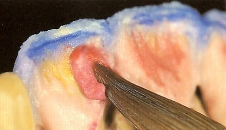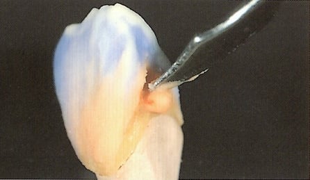A triangular area is removed from the cervical interdental area ,