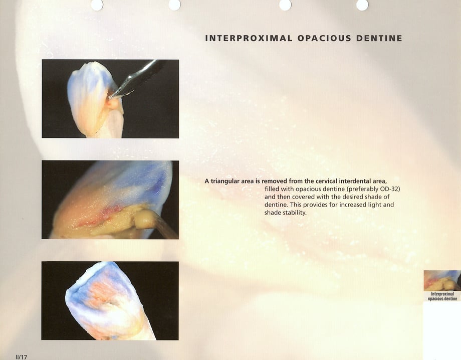 filled with opacious dentine ( preferably OD - 32 ) and then covered with the desired shade of dentine . This provides for increased light and shade stability .