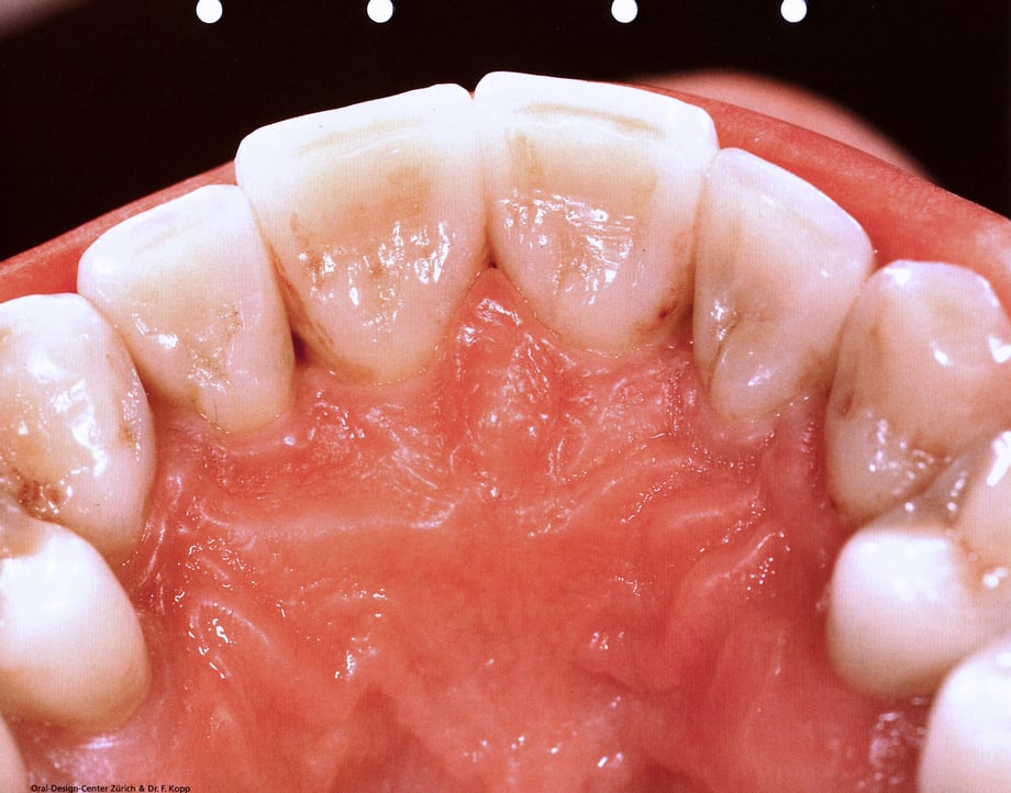 can be used to reproduce dark , discoloured areas in the palatal fossa .