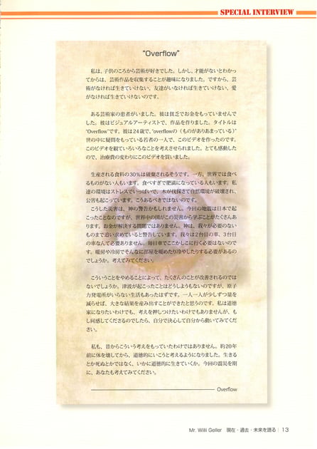 Geller: 講演で観せる”Overflow"が、被災された方々を含め、すべての方々へのわたしのメッセージです。