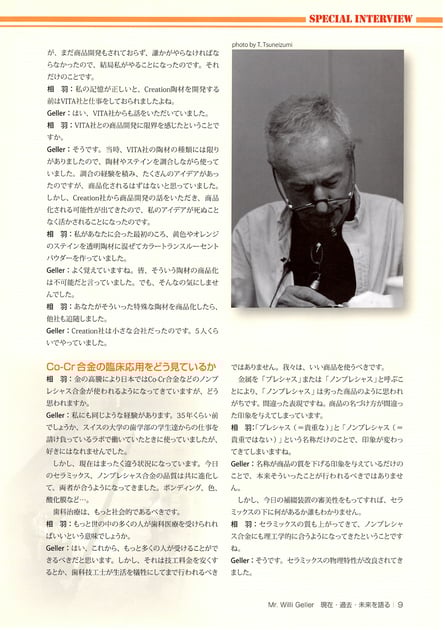 Geller : Creation陶材を開発する前にも、いろいろな会社から陶材開発のお話はいただいていましたが、Creation社の社員が同級生だったので協力することにしました。実際には私の名前だけが使いたかっただけらしかったのですが 、 まだ 商品 開発 も さ れ て おら ず 、 誰か が やら なけれ ば な ら なかっ た ので 、 結局 私 が やる こと に なっ た の です 。 それ だけ の こと です 。