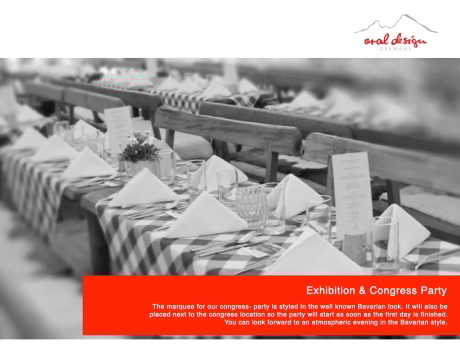 The marquee for our congress- party is styled in the well known Bavarian look. It will also be placed next to the congress location so the party will start as soon as the first day is finished. You can look forward to an atmospheric evening in the Bavarian style.
